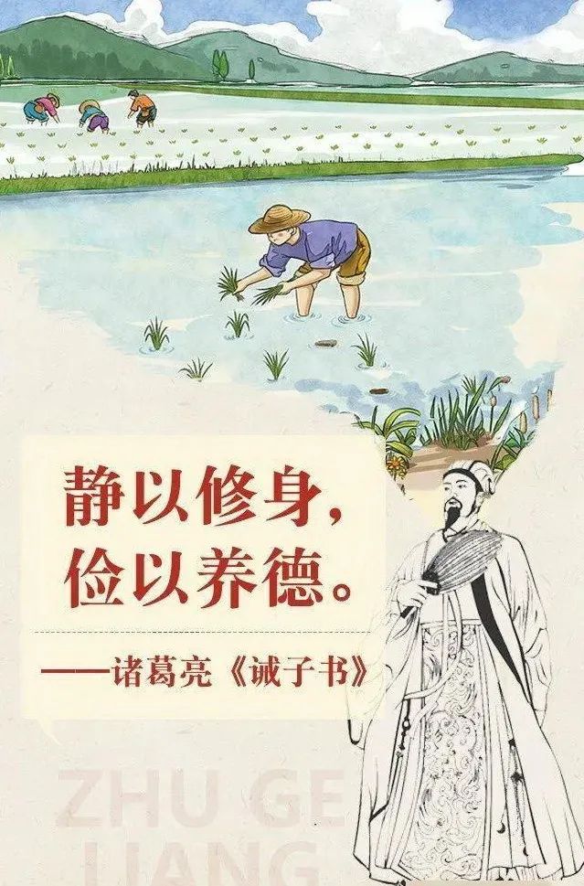 静以修身,俭以养德。出于诸葛亮《诫子书》:“夫君子之行,静以修身,俭以养德,非淡泊无以明志,非宁静无以致远。”指恬静以修善自身,俭朴以淳养品德。